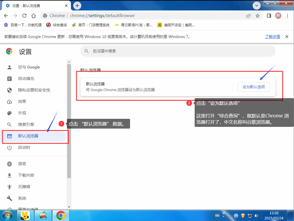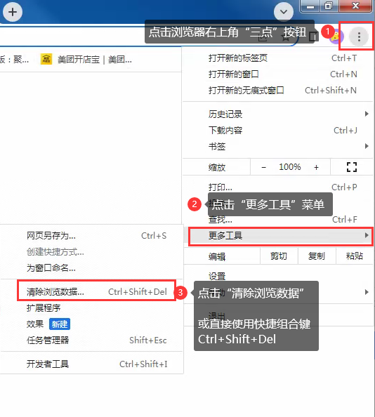 二、如果当前使用的浏览器已经是Chrome (谷歌浏览器),仍无法打开美团网、苏打优选、聚桂福、星享福、招商银行、QQ邮箱等网,请尝试按下面的步骤清理浏览器垃圾等历史数据。