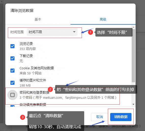 3、在弹出窗口中,时间范围指定“时间不限”选项 ,复选框(除密码)都打上勾,默认只需要去除“密码和其他登录数据”,最后点“清除数据”按钮: