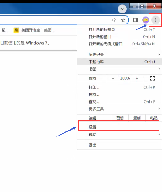 2、点浏览器的菜单按钮(一般为三点的图标,在弹出菜单选择“设置”。