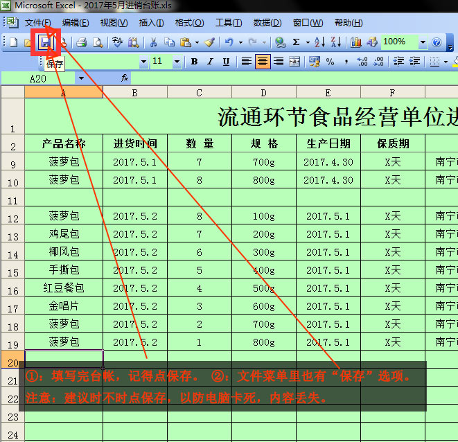 ①:填写完台帐,记得点保存。②:文件菜单里也有“保存”选项。