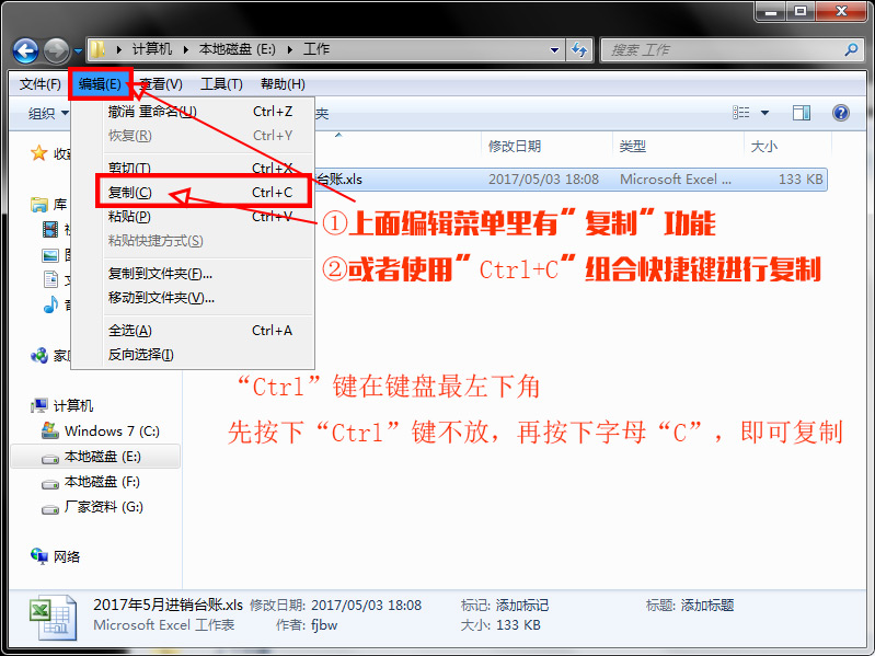 "Ctrl+C" 组合快捷键是复制功能,"Ctrl+V" 组合快捷键是粘贴功能。①下图的“编辑”菜单里有“复制”功能。
