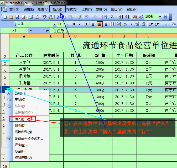 ①:在左边数字右击鼠标出现菜单,选择“插入” ②:在上面菜单“插入”里面找到“行”