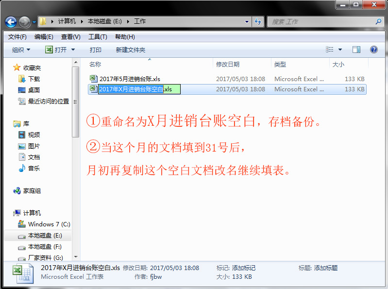 ①重命名为X月进销台账空白,存档备份。②当这个月的文档填到31号后,月初再复制这个空白文档改名继续填表。