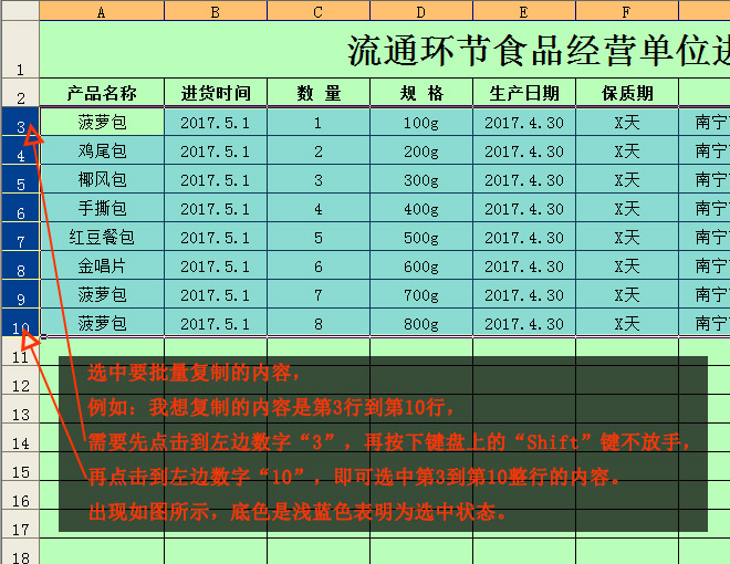 例如:我想复制的内容是第3行到第10行,需要先点击到左边数字“3”,再按下键盘上的“Shift”键不放手,