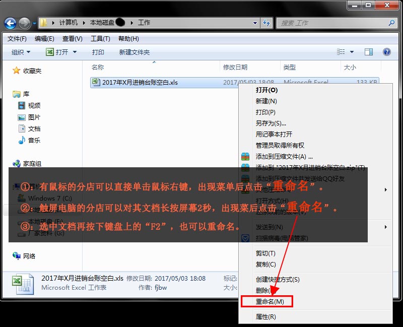 ①有鼠标的分店可以使用鼠标右键对文档重命名。②触屏电脑的分店可以对其文档长按2秒进行重命名。
