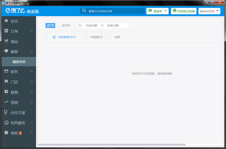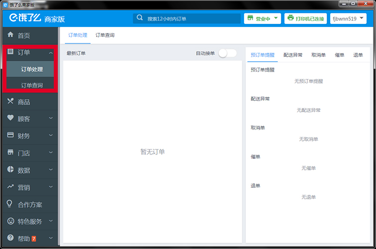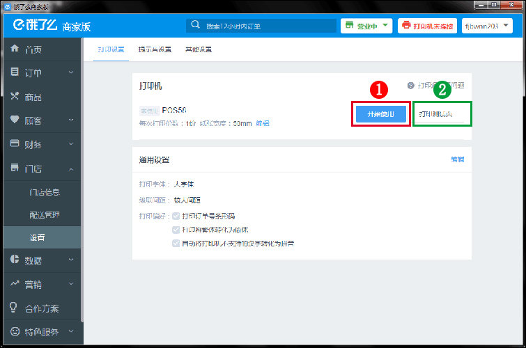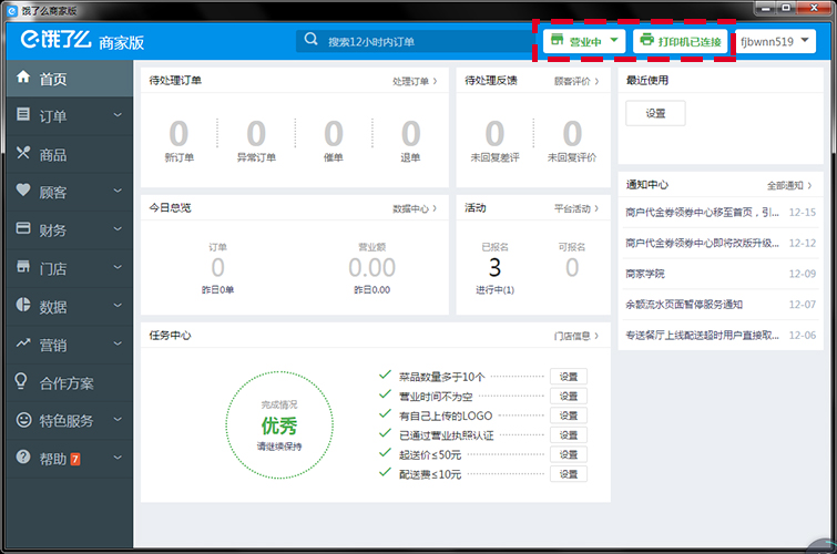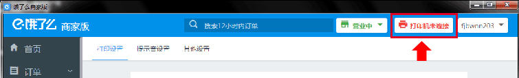 3、点击确定后正常登陆后看到是以下的界面(正常:【营业中】,【打印机已连接】的文字颜色为绿色,意味着可以接单,也可以正常打印小票)。