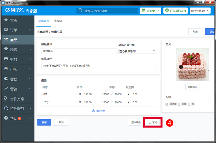 (2)单击产品右下角的“编辑”,在打开新的页面中选择”下架“,顾客无法再下单购买该产品。